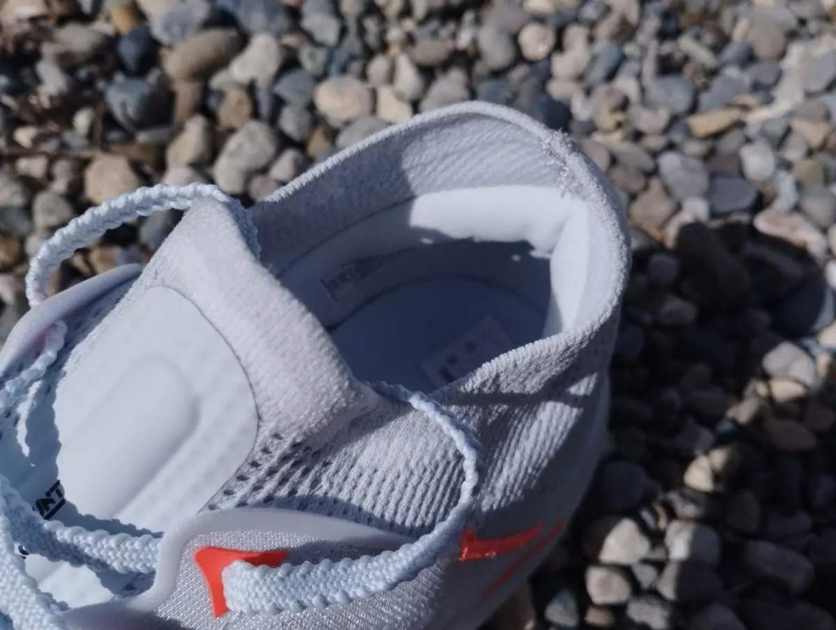 Невероятно плотная посадка по стопе. Во время примерки мне показалось, что кроссовки будто сделаны по слепку моей ноги. Они сидят анатомически идеально, но мой дефект стопы с некоторым расширением в средней части из-за такой плотности прилегания во время бега вверх доставлял небольшие ощущения давящего дискомфорта, что в целом ожидаемо. Плотный единый носок верха, соединенный с чашкой пятки фиксируют ногу так, чтобы во время быстрых гонок и заруб на самых сложных спусках не было шансов кроссовкам слететь и или завалиться в крен.