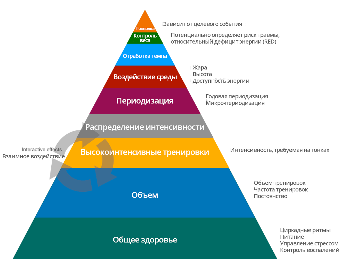 Перед тем как начать рассказывать о своих тренировках, думаю, важно выделить главное из того, что я делаю в контексте этого поста о тренировочном сезоне по трейлраннингу. Когда мы читаем посты о тренировках от спортсменов, мы часто сосредотачиваемся на деталях (высота, тренировки в жару, специфика интенсивных сессий, этап подводки и так далее), но не обращаем внимания на ОСНОВНУЮ часть работы, которая обеспечивает 90% результата (объем, образ жизни, постоянство на протяжении лет и так далее). Вот адаптация пирамиды потребностей тренировок на выносливость Стивена Сейлера, которую я нахожу релевантной для объяснения этого: