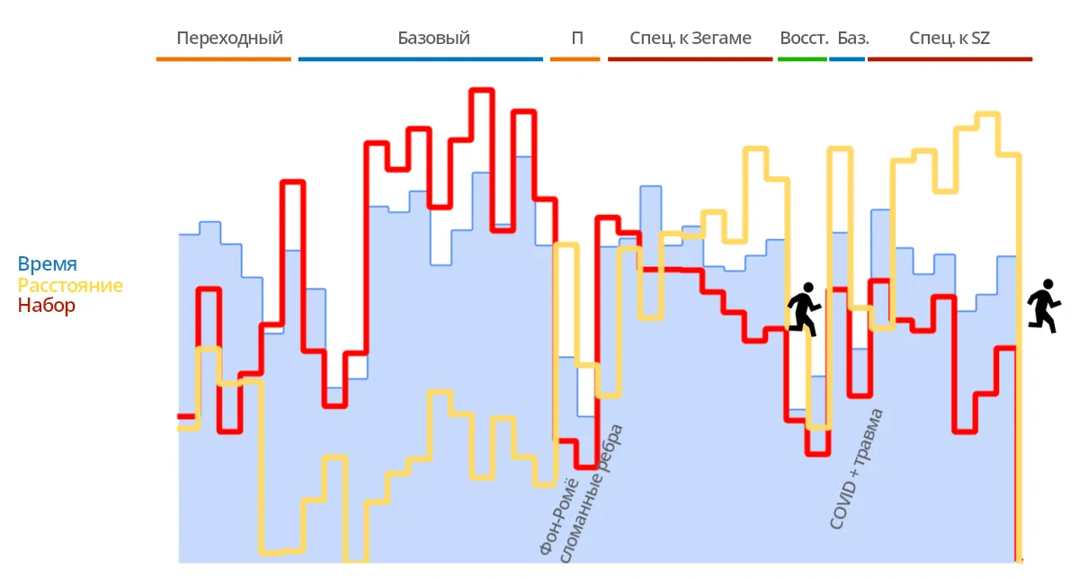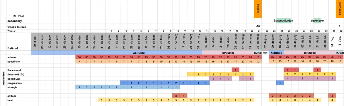 Общий план сезона по трейлраннингу был разделен на 4 блока. Первый — Базовая подготовка для повышения моей аэробной выносливости. Второй период был подготовкой специально к Зегаме, затем восстановительный период, и второй специфический блок для подготовки к Сьерр Зиналь.