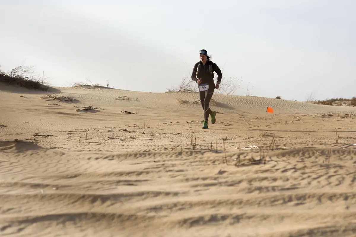 По технике бега по песку, я дам два совета, которые сам успешно применял на данном старте. Итак, толкаться по мягкой поверхности практически бесполезно, чем сильнее ты пытаешься оттолнкуться (стопой или бедром), тем больше вязнет нога и толчок уходит в никуда, кпд очень низкий. Для меня оптимально работало такое представление: я бегу по тонкому льду, почти двухопорный бег местами, тем самым он снижает давление на опору и как следствие ты меньше проваливаешься. Получается переступающий, стелющийся бегошаг. Конечно, нужно не забывать ставить максимально плоско стопу, прям шлёпать всей стопой по поверхности. Этот совет применим для равниных участков и небольших забеганий в барханы. Второй совет мой о технике спуска. Спуски на дистанции небольшие, но их очень много, постоянные небольшие сбросы высоты с барханов. Техника называется "прощай колени", ее можно применять именно в данной ситуации, на других трейлах ни в коем случае :). Песок нивелирует ударную нагрузку, вы можете позволить себе сделать очень широкий шаг, выхлестнуть голень максимально вперед, даже проехаться вперед на пятке (некий аналог глиссирования)".