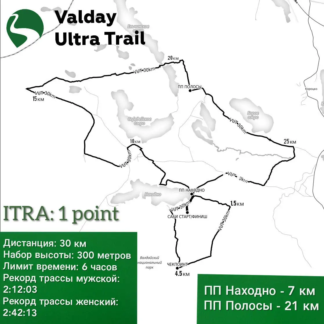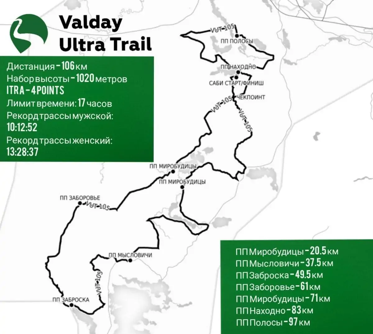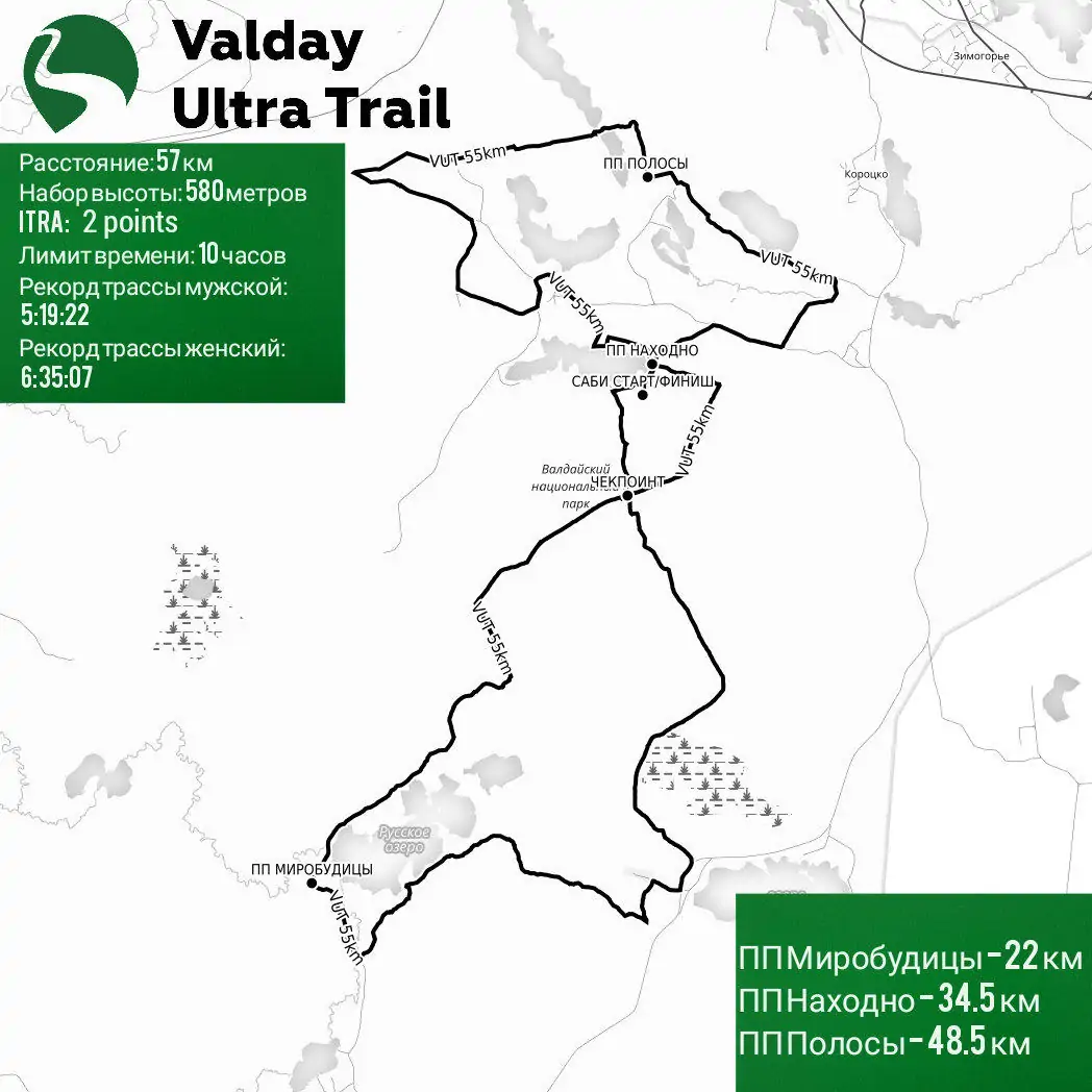 Дистанции ультра гонки VUT проложены по Большой Валдайской Тропе. Красивая природа Национального парка «Валдайский» и уже ставшие местными достопримечательностями: подвесной мост над рекой Полометь, самая настоящая бобровая запруда и 25-метровая обзорная вышка на горе Рыжоха, с которой открываются потрясающие виды на леса и озёра.