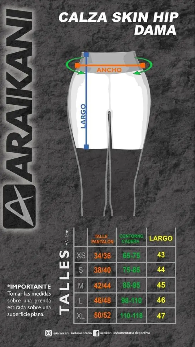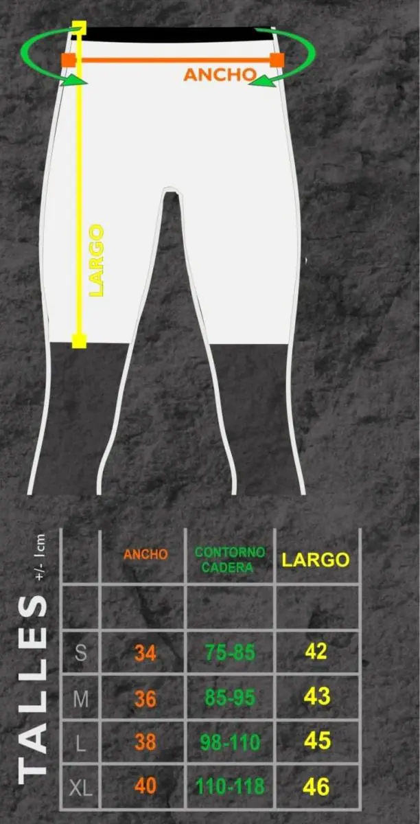 Внимательно выберите пол, измерьте длину (largo), ширину (ancho) в талии и обхват бедра (contorno cadera). Имейте ввиду эластичность изделия, а также прогнозируемый вес переносимых вещей. При пограничных размерах рекомендуем выбрать меньший размер.