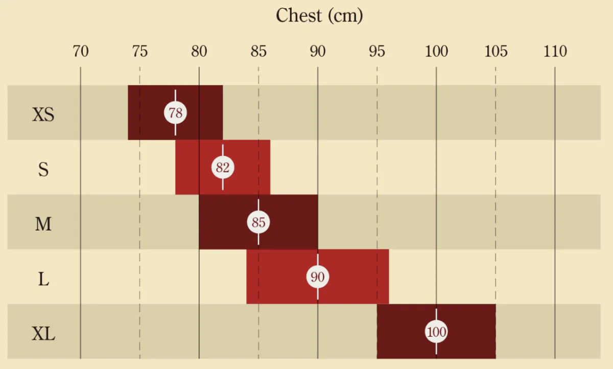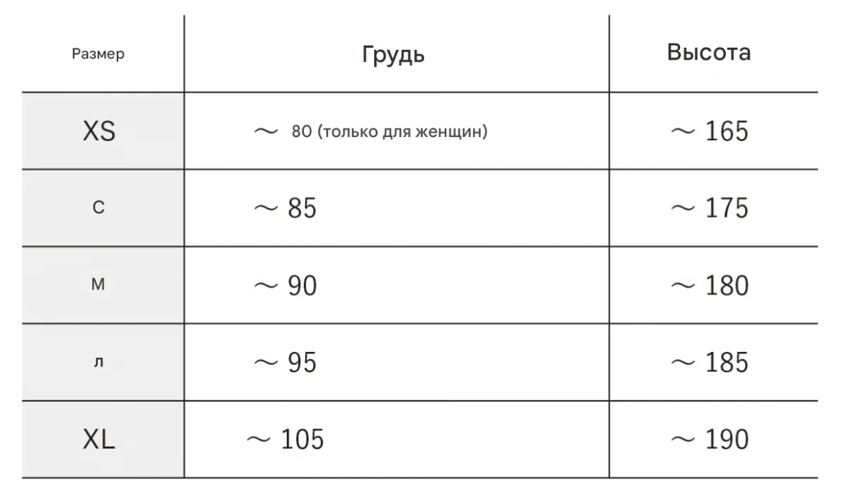 XS: Обхват груди: ~80 см (только женские размеры), рост: ~165 см