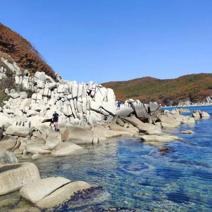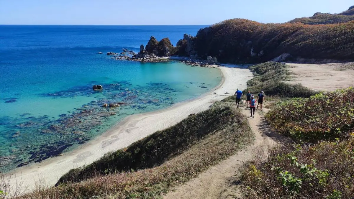 " - Берег Японского моря в окрестностях города Находки. Эти места с лазурной водой и белым песком, каменными останцами, морскими курумниками, морскими ежами и прибрежными трейловыми тропами - любимые места всех приморцев. В летний сезон здесь не протолкнуться, а во время нашей поездки - практически весь берег будет только для нашей компании! Романтика по вечерам и красивые морские виды на тренировках обеспечены!" |